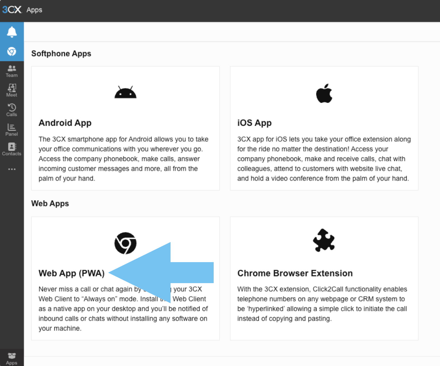 Þá ættum við að vera mætt á stjórnborð 3CX. Þarna viljum við velja Apps niðri í vinstra horninu.