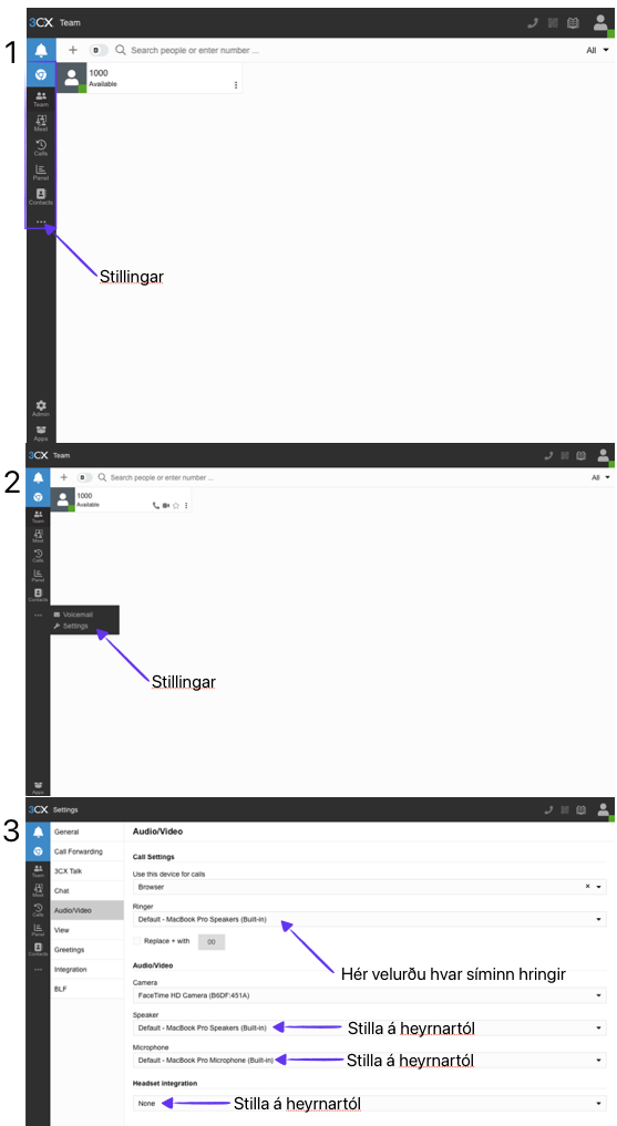 Ef þú ert með heyrnartól þá mælum við með að stilla þau rétt inná 3CX kerfið upp á að fá fulla virkni.