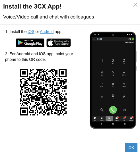 Þú getur síðan valið hvort þú viljir skrá þig inná 3CX í símtækinu þínu! Ef þú vilt bara hafa forritið í tölvunni geturðu ýtt á gráa exið á glugganum í miðjunni.